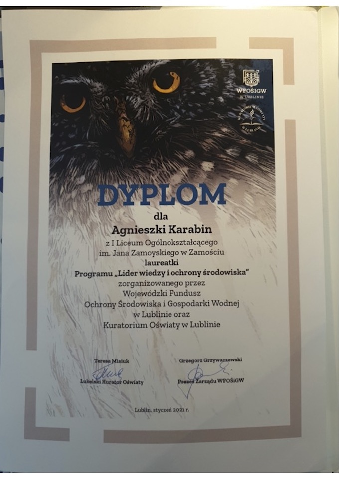 Gabrysia Byra /3G/ otrzymała tytuł laureatki oraz stypendium w ramach programu „Lider Wiedzy i Ochrony Środowiska” realizowanego przez WFOŚiGW w Lublinie we współpracy z Kuratorium Oświaty. Honorowy patronat nad programem objęli Poseł do Parlamentu Europejskiego Beata Mazurek, Minister Klimatu i Środowiska Anna Moskwa oraz Minister Edukacji i Nauki Przemysław Czarnek. Uroczysta gala podsumowująca tegoroczną edycję programu odbyła się 16 grudnia 2022 r. w Tomaszowie Lubelskim.