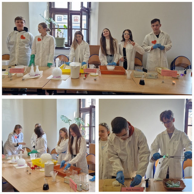 W roku szkolnym 2023/2024 pokazy chemiczne dla uczniów szkół podstawowych przygotowali uczniowie klas 1g, 1h, 2i oraz 2h. Uczniowie wykonali m.in. doświadczenia z suchym lodem, chemiczny kameleon, węże Faraona, znikający fiolet oraz płonące banknoty i płonącą piane.
